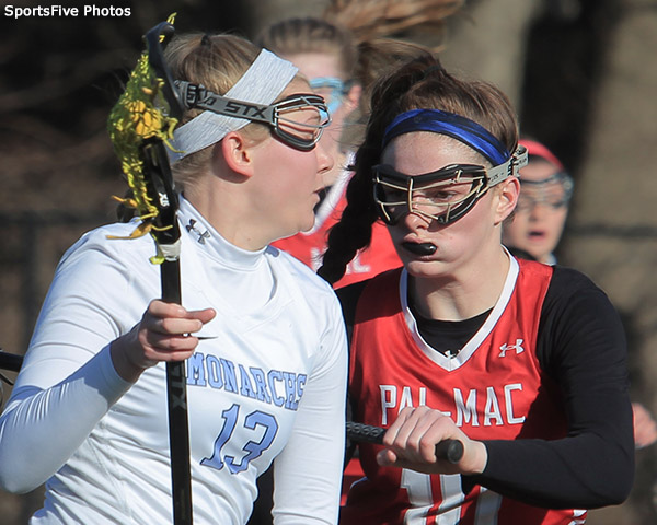 Mercy dominated the second half to defeat Pal-Mac 13-9. The Monarchs scored 9 of the last 11 goals in the contest to come back from a three goal deficit. The main difference in the second half was ball-time. Mercy picked up the draw controls in the second half and denied the Red Raiders the ball. Leading in draw controls for Mercy was Karli Harnischfeger with 5.
