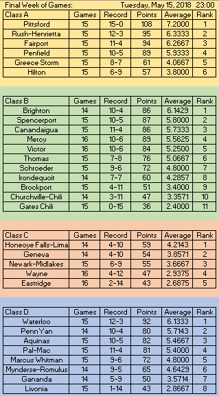 Below are the point totals as of May 15th, 2018. Please note that the seeding is subject to change until the final game of the season has been played. It is important to note that the Points for Win/Loss can change and will change as games are played.