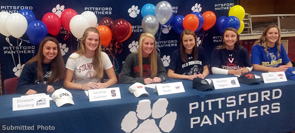 It was another signing day in Pittsford as the Girls Lacrosse Team celebrated with six seniors who signed National Letters of Intent indicating their decision to play college lacrosse. Singing were Elizabeth Landing (New Hampshire), Caroline Cullinan (Stanford), Jenna Doyle (Virginia Tech), Heather Higgins (Old Dominion, Julie Quevedo (Virginia), Mackenzie Winn (Delaware).