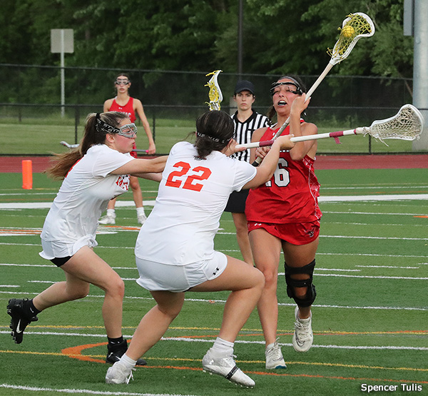 FAIRPORT-11 at RUSH-HENRIETTA-9 - No. 3 Fairport fought back from a 7-2 halftime deficit, Ella Peers (4g) scored the go-ahead goal early in the fourth quarter, and Marisa Test made two late saves to secure the upset win. Peers also collected a game-high 11 draw controls. Camryn DuBose and Katie Mallaber had three goals apiece for Fairport (11-6). For No. 2 Rush-Henrietta, Riley Brown led the scoring with four goals and one assist, and Ashlyn Roberts contributed three goals. The Royal Comets end their season with a record of 12-5. The Red Raiders move on to the class A finals, where they will face No. 4 Pittsford on Tuesday. [ BOX SCORE]